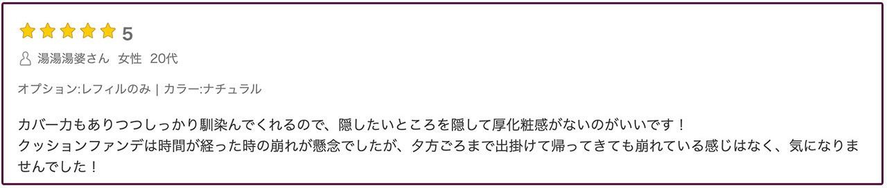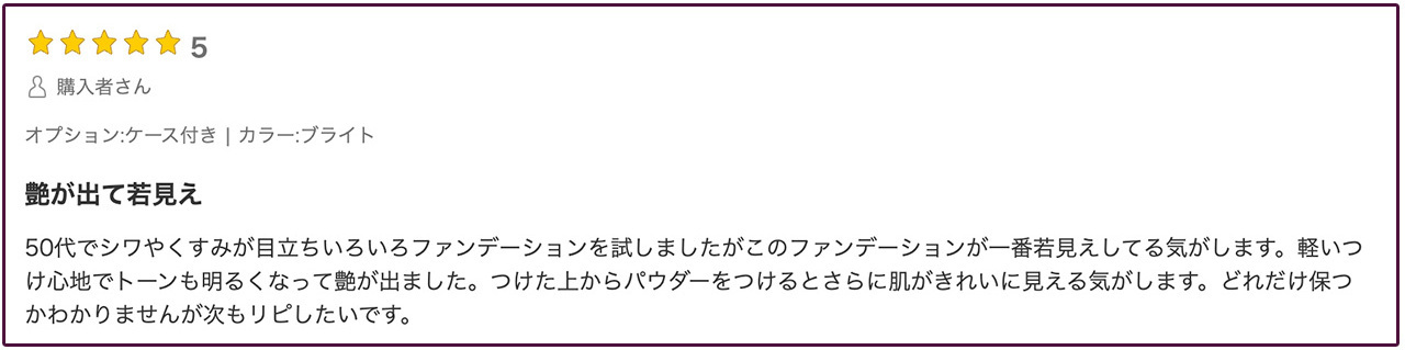 今までで一番買ってよかった商品!!これまでのファンデとの違いに衝撃を受けました。とにかく仕上がりが綺麗すぎて、さらに崩れにくいのも◎やっと満足いくものに辿り着けました。
